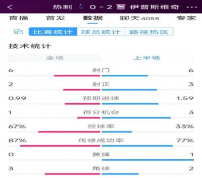 体育资讯11月10日报道宣称 本轮英超热刺对阵伊普斯维奇上半场已经结束,热刺主场两球落后于积分倒数第二的伊普斯维奇。以下为双方半场数据对比: