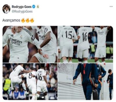赛后,皇马前锋罗德里戈在社交媒体晒图,庆祝球队胜利,他还配文写道:“我们继续前进