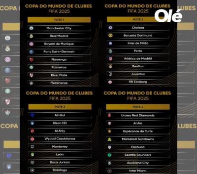 一档:曼城(英格兰)、皇马(西班牙)、拜仁(德国)、巴黎(法国)、弗拉门戈(巴西)、帕尔梅拉斯(巴西)、河床(阿根廷)、弗鲁米嫩塞(巴西)