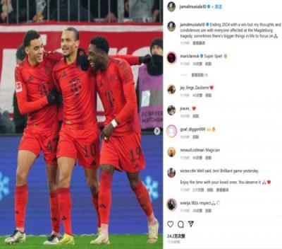 22场14球6助攻!穆西亚拉社媒:以胜利结束2024,但生活大于足球