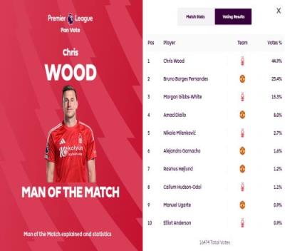 赛后,英超官方宣布,克里斯-伍德当选本场比赛的最佳球员,他获得了44.9%的得票率。