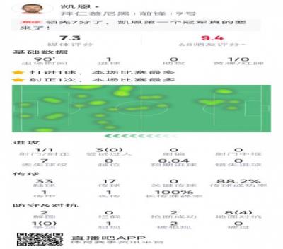 凯恩本场数据:首开记录,1次射门即破门,2抢断&2解围