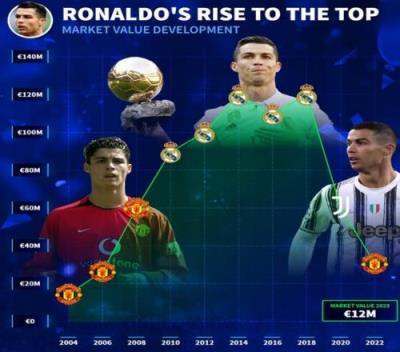 《转会市场》在2004年才录入C罗的身价,2004年达到1800万欧元,2008年赢得欧冠时上涨到6000万欧元。
