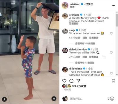 体育资讯8月22日报道宣 C罗在社交媒体上庆祝YouTube频道粉丝超过800万,维尼修斯为他的动态留言。