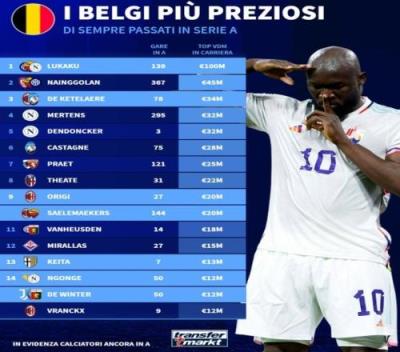 体育资讯11月15日报道宣称 在意甲赛场上,有一批比利时球员成为球队的核心球员,德国转会市场盘点了意甲历史身价最高的比利时球员,卢卡库1亿欧元居首。