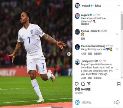 英格兰队官方社媒晒出斯特林效力球队的照片,并配文:“祝你度过一个美妙的生日,斯特林!”