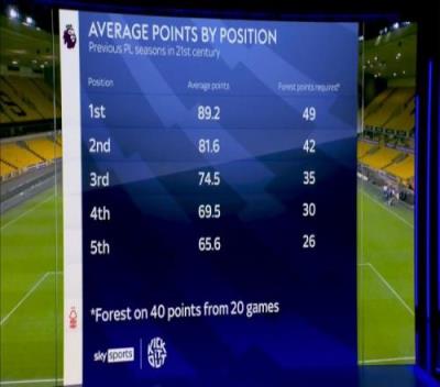 诺丁汉森林近期的强势表现让媒体和球迷对他们的最终成绩抱有更高期待,天空体育统计了本世纪以来英超前5名的平均积分,冠军球队89.2分,亚军81.6分,季军74.5分。