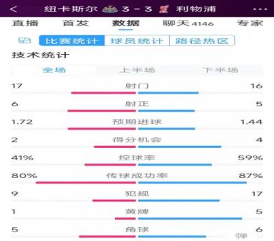 体育资讯12月5日报道宣称 本轮英超利物浦客场3-3战平纽卡,以下为双方全场数据对比: