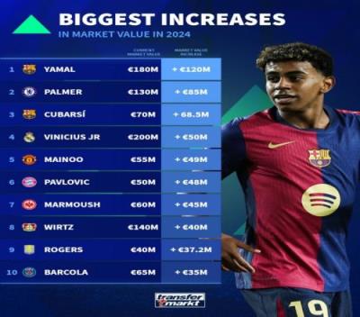 2024年身价上涨榜:亚马尔+1.2亿欧居首,帕尔默+8500万欧次席