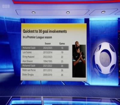 英超单赛季参与30球最快榜:萨拉赫18场居首,苏牙、哈兰德二三位