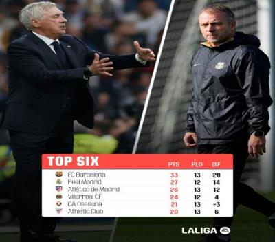 体育资讯11月12日报道宣称 西甲第13轮,榜首巴萨0-1客负皇家社会,皇马主场4-0大胜奥萨苏纳,目前皇马少赛1场落后6分。