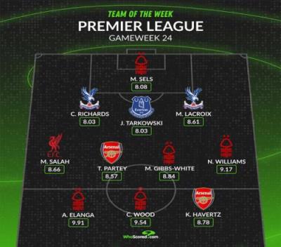 WhoScored英超第24轮最佳阵:萨拉赫、哈弗茨在列,诺丁汉森林5人
