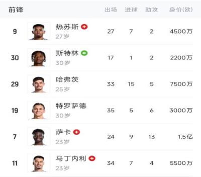 阿森纳的前锋线再伤1人,6人的锋线群已经有一半伤缺:萨卡、热苏斯、马丁内利伤,哈弗茨、斯特林、特罗萨德健康。