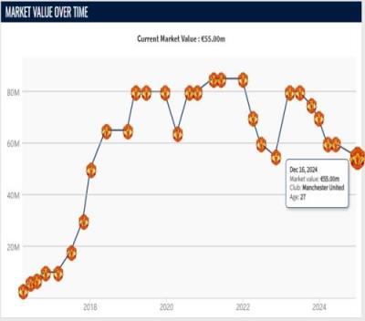 德转更新最新英超球员身价,“红魔太子”拉什福德的身价降至5500万欧。