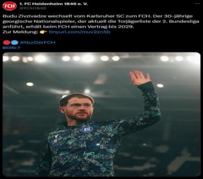 德甲海登海姆官方宣布,齐夫齐瓦泽加盟球队,双方签约至2029年。目前在德甲积分榜,海登海姆积10分暂列第16位,在为保级而战。