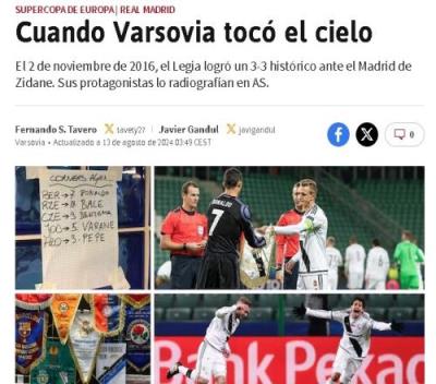 体育资讯8月13日报道宣 2016年欧冠,波兰球队华沙莱吉亚曾3-3战平皇马。当时华沙莱吉亚的球员雅库布和吉尔莫接受采访,回忆了这段经历。