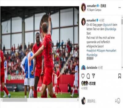 穆勒在社交媒体上晒出庆祝进球的照片,并写道:“德甲开始前的最后一场测试,我们以4-0的比分战胜草蜢。”