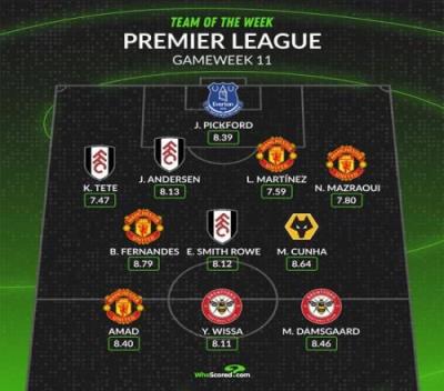 体育资讯11月11日报道宣称 WhoScored根据球员评分列出了英超第11轮最佳阵容,曼联4名球员入选。