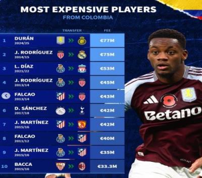 德转列哥伦比亚球员转会费榜:杜兰破J罗纪录,恒大4200万签J马