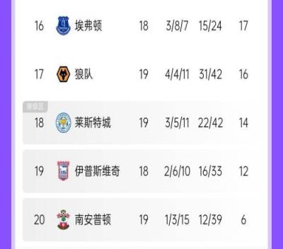 目前,降级区的三支队伍均是本赛季的升班马球队:莱斯特城、伊普斯维奇、南安普顿。值得一提的是,去年升级的三兄弟伯恩利、谢菲联和卢顿赛季结束时全部打道回府,掉回英冠。