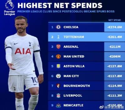 根据德国转会市场网统计,在波斯特科格鲁上任后热刺是英超净投入第二多的球队,达到2.614亿欧元,仅次于净投入2.746亿欧元的切尔西。