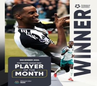 伊萨克12月代表纽卡出战7场比赛,贡献8球2助攻。PFA官方晒出伊萨克的海报,确认他在球迷投票中胜出,当选PFA英超12月最佳球员。