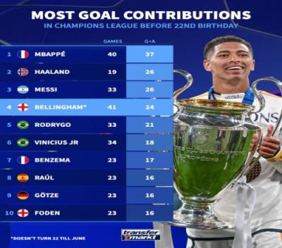体育资讯1月29日报道宣称 德国转会市场统计了球员22岁生日之前在欧冠比赛中的参与进球数量,并列出榜单,姆巴佩、哈兰德、梅西、贝林厄姆排名前四,其中贝林厄姆今年6月年满22岁,仍有机会冲击更高的排名。