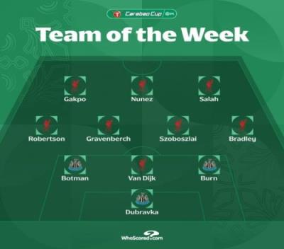 体育资讯2月8日报道宣称 联赛杯半决赛次回合已经完赛,纽卡2-0双杀阿森纳、利物浦4-0逆转淘汰热刺。联赛杯官方也评出了本周最佳阵容。
