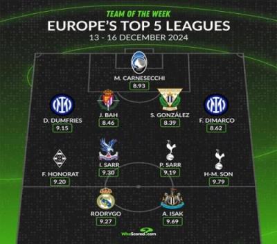 体育资讯12月17日报道宣称 本周五大联赛已经完赛,whoscored也列出了本周五大联赛评分最佳阵容,罗德里戈、孙兴慜领衔。