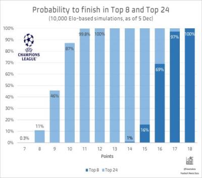 体育资讯12月10日报道宣称 专业足球数据媒体Football Meets Data经过超算万次模拟,得出了本赛季欧冠晋级线的可能性。