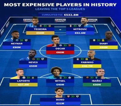 体育资讯8月4日报道宣 沙特联赛在近2年连番引进强援,《转会市场》也统计了非五大联赛的历史转会费最贵阵,沙特超共计8人。