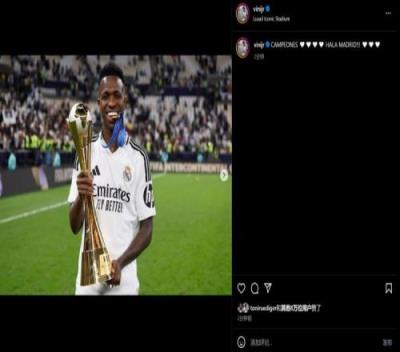 双喜临门!维尼修斯庆祝洲际杯夺冠:我们是冠军!皇马加油