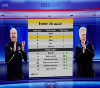 本赛季戴奇、莫耶斯执教埃弗顿数据: