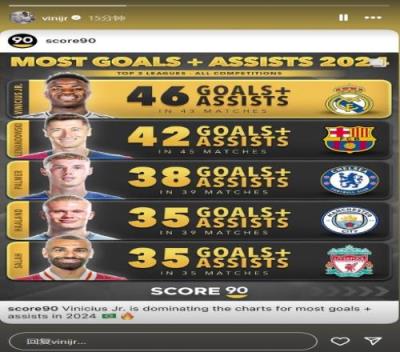 维尼修斯转发帖子:参与46球维尼修斯主宰2024年进球+助攻榜