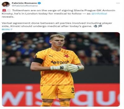 罗马诺指出,热刺接近签下21岁捷克门将金斯基,各方已经就这笔交易达成口头协议,球员今日来到伦敦接受体检,预计体检将在热刺对阵纽卡的比赛后进行。
