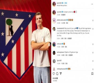 挪威28岁中锋索尔洛特社媒晒加盟马竞照:梦想成真
