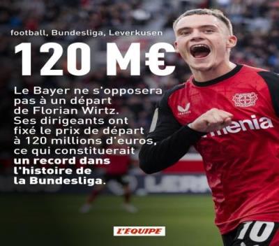 1.2亿欧起拍!队报:维尔茨明夏可能去拜仁或皇马,药厂要价1.2亿