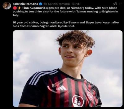 罗马诺:纽伦堡16岁前锋库萨诺维奇将续约,拜仁、药厂持续关注