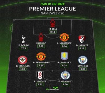 体育资讯1月7日报道宣称 数据网站Whoscored评选出英超第20轮最佳阵容,其中哈兰德、B费等球员在列,以下为具体阵容: