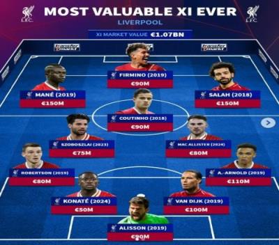 体育资讯1月9日报道宣称 德转盘点了利物浦队史身价最高阵容,其中萨拉赫领衔的昔日红箭三侠在列,以下为具体阵容: