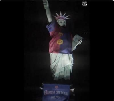 巴萨官方更新社媒动态,晒出给自由女神像穿上巴萨球衣的视频,并配文:“纽约是红蓝色的。”