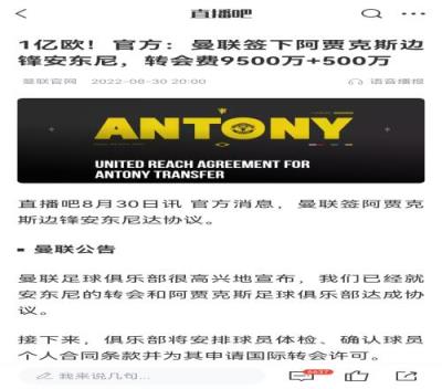 最终曼联一路加价,据阿贾克斯官方公告透露,安东尼最终转会曼联的费用为9500万欧元+500万浮动,总价正好是1亿欧元。
