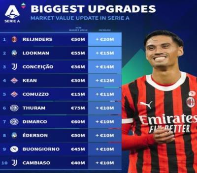 体育资讯12月22日报道宣称 《转会市场》在近日更新了意甲球员身价,并列出了身价上涨榜,赖因德斯暴涨2000万欧最多。