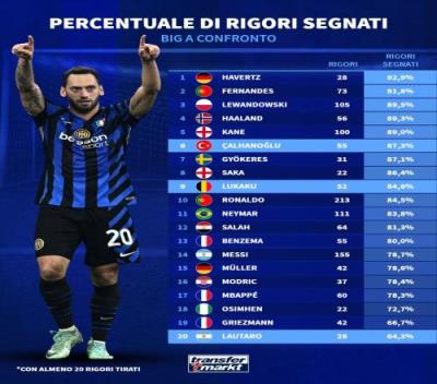 体育资讯12月06日报道宣称 德转对主罚点球超过20次的球员进行统计,点球命中率最高的是哈弗茨,主罚28次命中率接近93%,最低的是劳塔罗,主罚28次命中率刚刚超过64%。