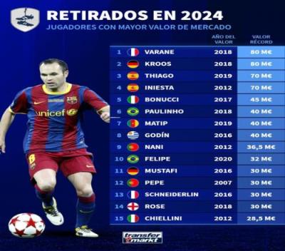 体育资讯12月27日报道宣称 德国转会市场列出了今年退役球员的巅峰身价榜,瓦拉内、克罗斯8000万欧居首,蒂亚戈、伊涅斯塔7000万欧。