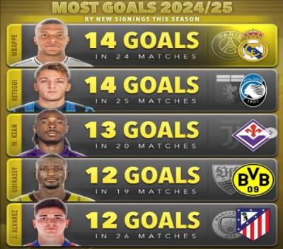 体育资讯12月25日报道宣称 数据显示,姆巴佩仍然是24/25赛季五大联赛进球最多的新援。