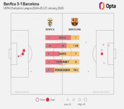 体育资讯1月22日报道宣称 欧冠联赛阶段第7轮,巴萨上半场被本菲卡3次射正打进3球。