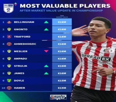 英冠球员身价前10:乔贝贝林厄姆1800万欧并列第一