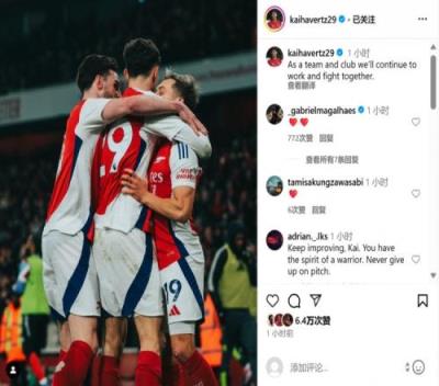 哈弗茨在个人社媒晒出与队友庆祝进球的照片,配文鼓励道:“我们整个球队将会继续努力并且团结一致!”