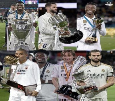 而皇马本赛季理论上最多能够捧起7座冠军奖杯,剩下的5项赛事分别是:西甲、欧冠、国王杯、西超杯以及明夏举行的新世俱杯。